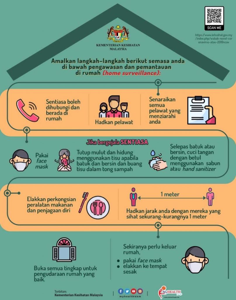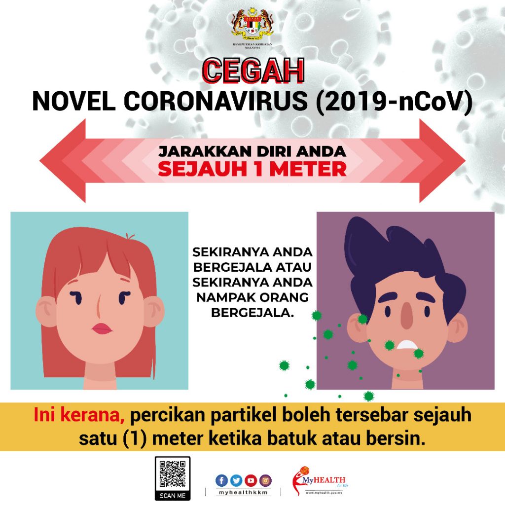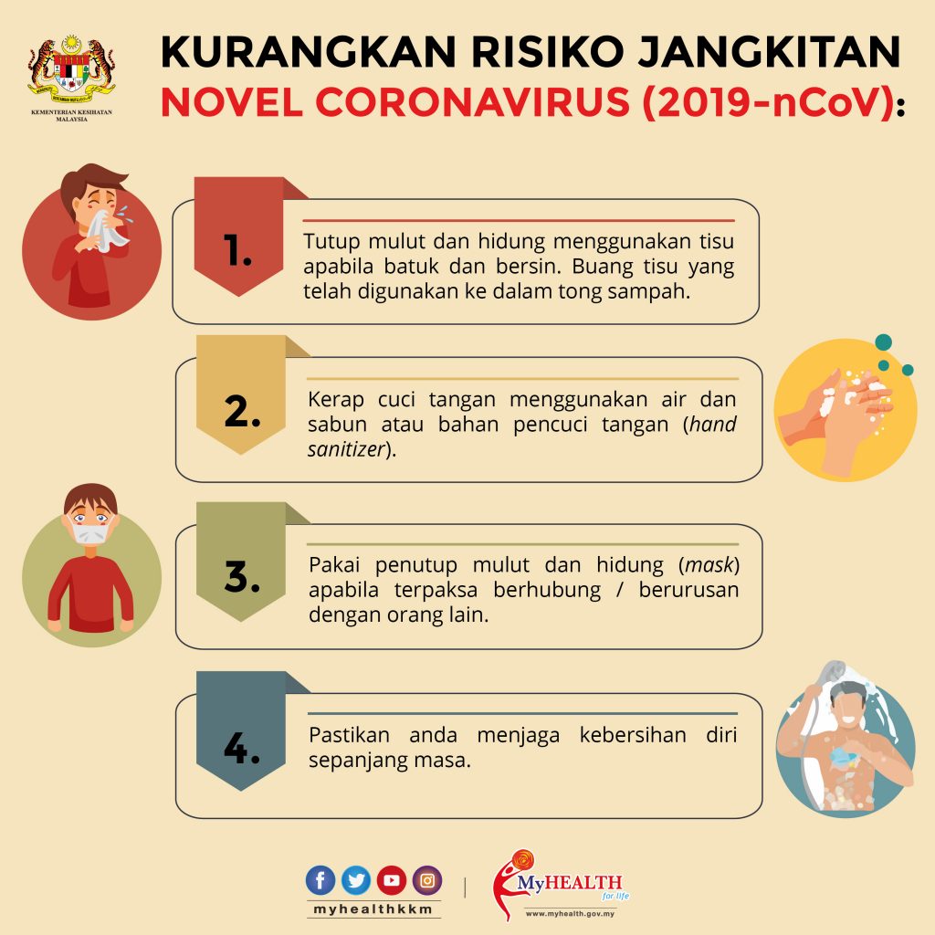 Disini saya lampirkan maklumat infografik dari Kementerian Kesihatan Malaysia bagi mencegah penyakit Koronavirus pada rakyat Malaysia. KKM menghasilkan maklumat dalam bentuk infografik supaya lebih mudah difahami. Anda juga boleh klik terus ke laman web Kementerian Kesihatan Malaysia di sini.